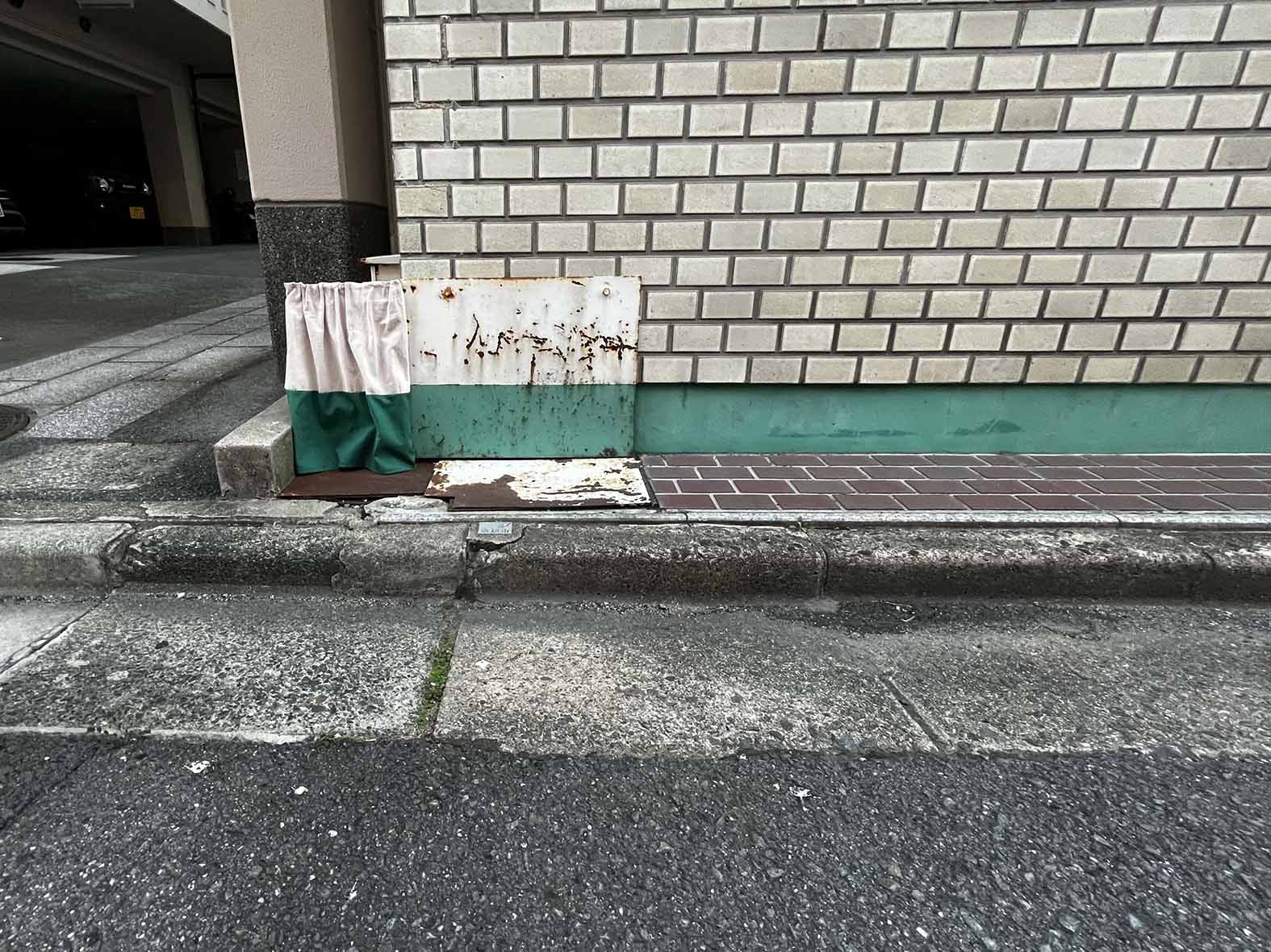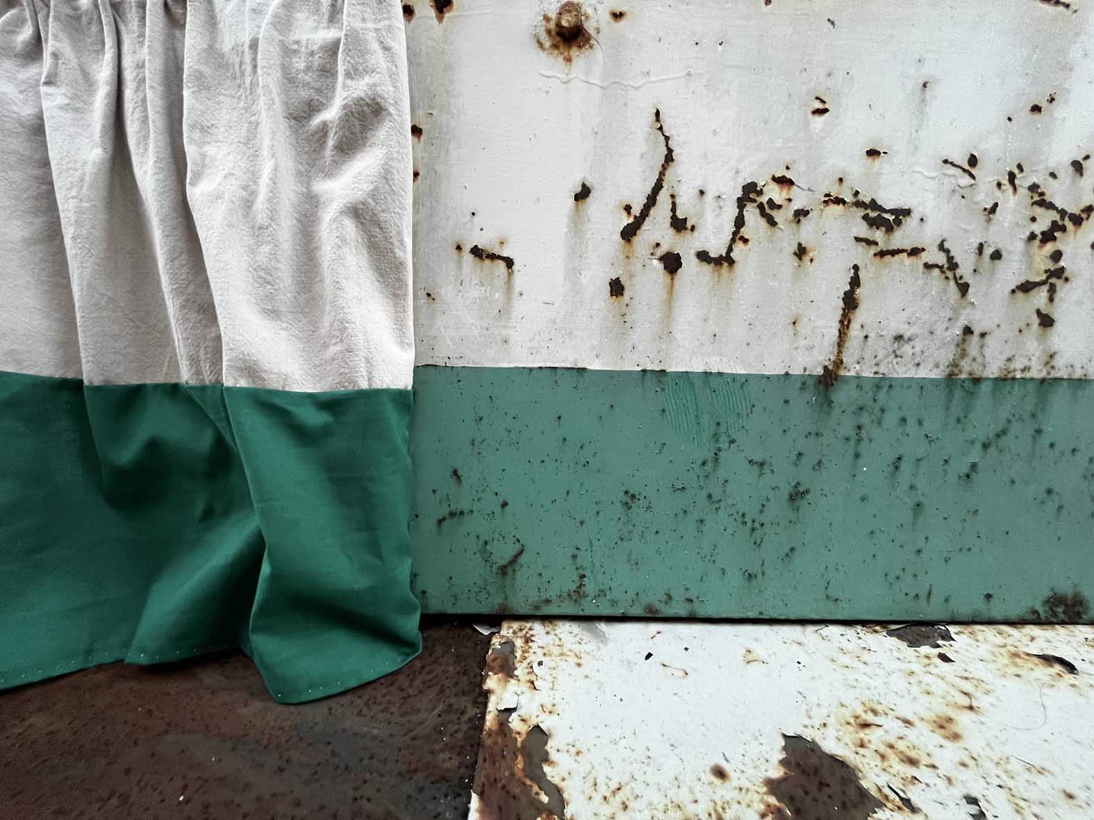 While strolling through the hot streets of Kyoto, I came across a green-and-white wall with a metal plate painted to match it, which immediately reminded me of my green curtain called What We Thought Was a Wall Turned Out to Be a Curtain. I decided to add a small curtain to it. Anyone who has been to Japan knows the great love and care for detail that is woven into everyday life. It is not unusual to encounter small sewn elements attached to stone sculptures in temples and along the streets.