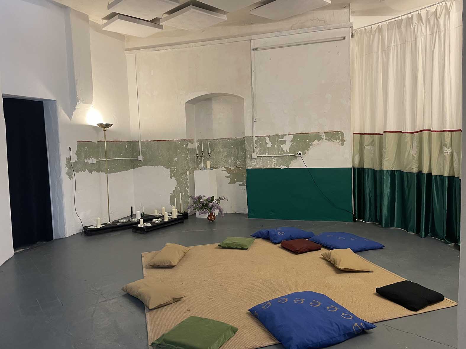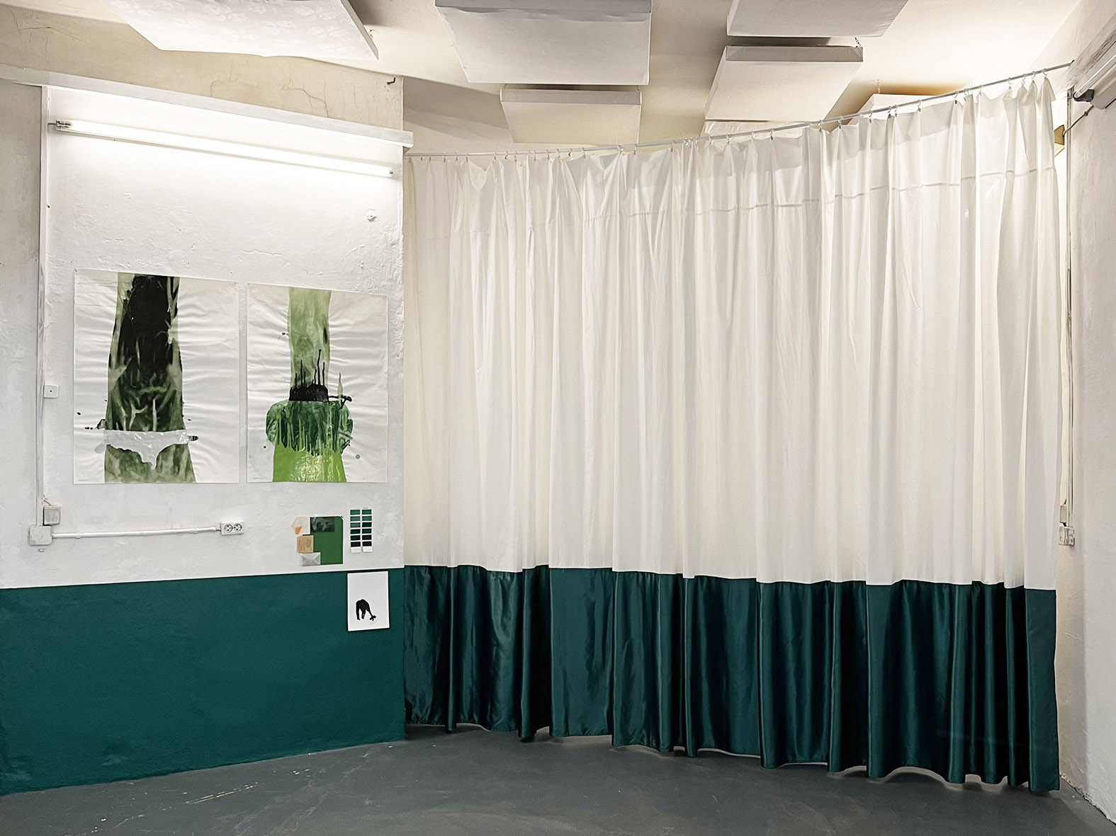 After the exhibition in the Haus am Lützowplatz ended, I hung its curtain in my studio-and-event space at Halfsister and painted one wall dark green to match. Later, while deinstalling another work in Halfsister, some paint chipped off the wall and I realized that the room had originally been painted a different shade of green. I adjusted the curtain accordingly and called it “The Berlin Edition”. This addition added a site-specific aspect to the work – in Berlin you don't need to dig far to discover history.