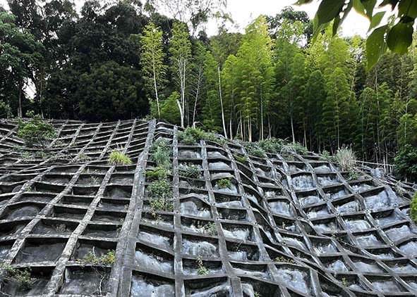 I have visited Japan fifteen years ago with a project, and in 2025 again as part of the KUMANONISUMU!2025 residency program in Mie, Kumano. On both journeys I was struck by the presence of 法枠工 (hōwaku-kō), the concrete grids that line Japan’s hilly regions. Designed to prevent landslides, these vast structures retrace the shapes of cliffs and forested slopes, folding human engineering into the very language of the landscape.