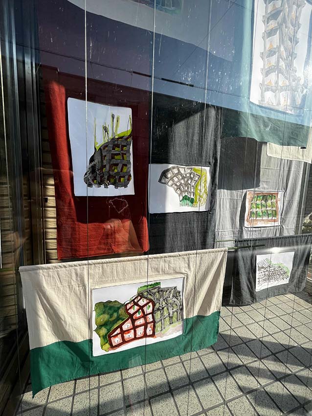 The hōwaku-kō series comprise fifteen drawings, each mounted in a textile frame sewn specifically for this project. This presentation gestures toward Japan’s textile and curtain traditions, evoking the ways cloth has been woven into everyday life.